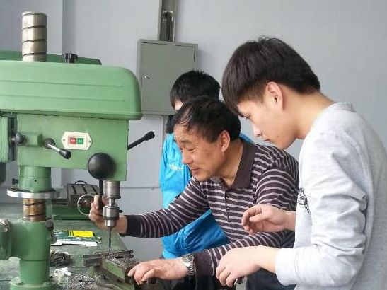 圖為指導(dǎo)老師和同學(xué)們一起對(duì)零件進(jìn)行孔加工