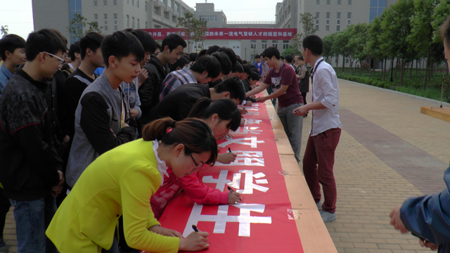 (師生在活動(dòng)主題條幅上簽字)