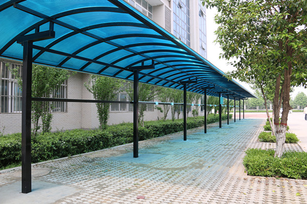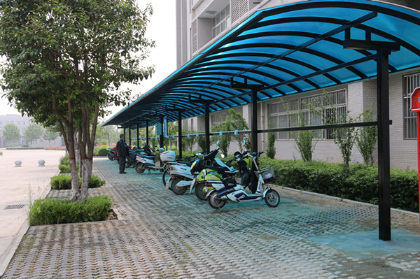 立夏時(shí)節(jié),鮮花綻放、綠樹(shù)成蔭。沐浴著宜人的陽(yáng)光,漫步于學(xué)院林蔭小道或闊步于樓間馬路,不經(jīng)意間會(huì)驚訝的發(fā)現(xiàn),學(xué)院實(shí)習(xí)北樓北側(cè)便道上仿佛一夜間多出了兩個(gè)靚麗的“蓬式”建筑。走近一看,原來(lái)是兩個(gè)集充電和存車于一體的新建車棚!