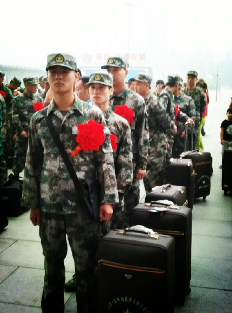 參軍報國,建功軍營。歡送現(xiàn)場,整裝待發(fā)的同學(xué)們身穿迷彩服,胸戴大紅花,紅光滿面、神采飛揚,顯得分外精神。