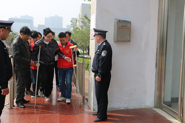 志愿者們幫助一名行動(dòng)不便的考生進(jìn)場