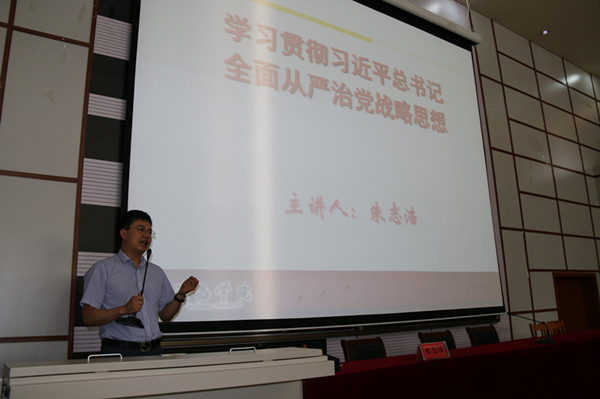 在培訓(xùn)會(huì)上,朱志浩分別從習(xí)近平總書記全面從嚴(yán)治黨戰(zhàn)略思想的背景、部署、特點(diǎn)和意義等三個(gè)方面展開,系統(tǒng)闡述了全面從嚴(yán)治黨對(duì)于新形勢(shì)下加強(qiáng)黨的建設(shè)的重要意義,以及全面從嚴(yán)治黨在“四個(gè)全面”戰(zhàn)略布局中的重要地位和作用。朱志浩強(qiáng)調(diào),習(xí)近平總書記關(guān)于全面從嚴(yán)治黨思想是高度的政治性、理論性與指導(dǎo)性、針對(duì)性的有機(jī)統(tǒng)一,貫穿著馬克思主義的黨性原則,閃耀著馬克思主義的黨建理論光芒,充滿著合黨心、順民意、鼓士氣的巨大感召力。