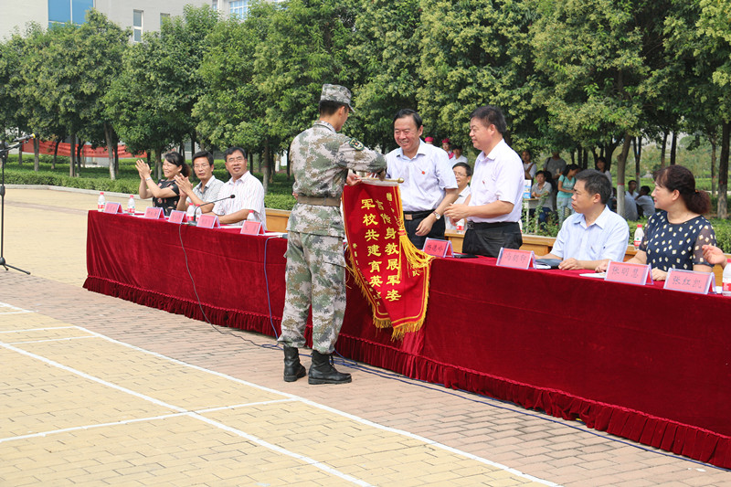 最后,楊魯西書記和楊德嶺院長代表學(xué)院向承訓(xùn)部隊教官代表贈送了旌旗,感謝部隊對學(xué)院軍訓(xùn)工作的大力支持。
