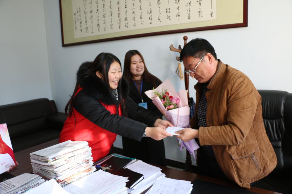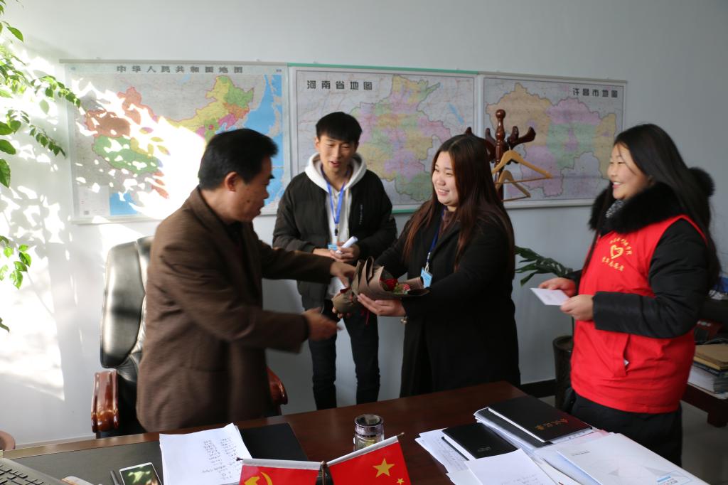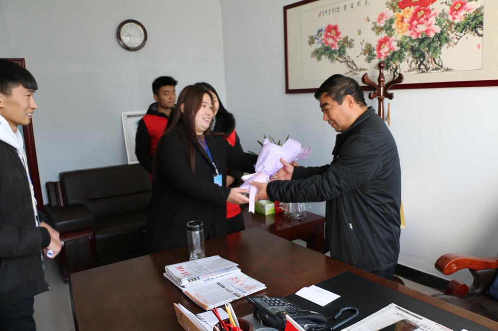 早上八點(diǎn)半由團(tuán)委老師帶領(lǐng)團(tuán)干代表利用課間時(shí)間分別向?qū)W院黨委書記楊魯西,院長楊德嶺,副院長商淑敏,副院長劉濤,副院長馮朝印,黨委委員工會(huì)主席張勇,黨委委員組宣部部長張明慧送以鮮花和最真摯的感恩祝福。
