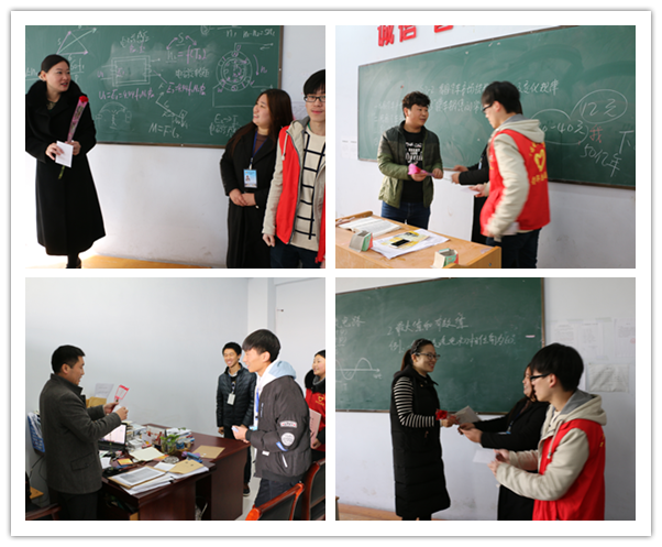 接著,團(tuán)干代表們依次向?qū)W院任課老師送去最真摯的祝福!感謝平日里老師對同學(xué)們殷殷教誨。之后,團(tuán)干代表們還向?qū)W院門衛(wèi)及學(xué)院環(huán)衛(wèi)工人等基層服務(wù)人員送以節(jié)日的祝福,感謝工人們?yōu)榱私ㄔO(shè)美麗校園的辛勤付出。