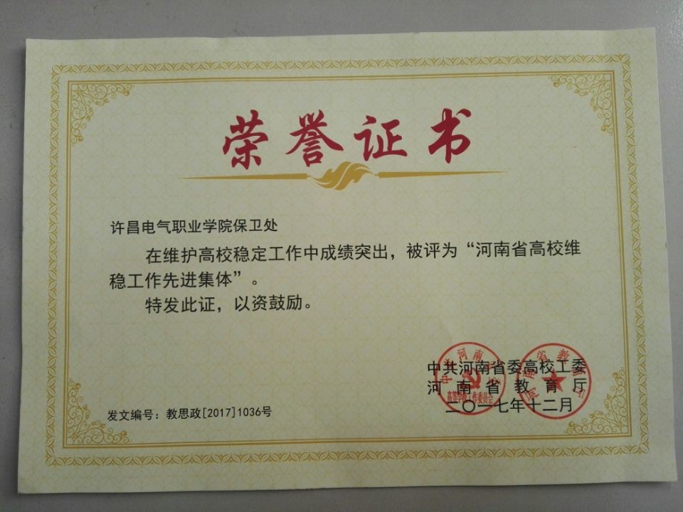 近日,河南省委高校工委、河南省教育廳聯(lián)合下發(fā)《關于表彰全省高校維穩(wěn)先進集體和先進個人的通知》(教思政〔2017〕1036號),我院保衛(wèi)處被評選為“全省高校維穩(wěn)先進集體”,學院保衛(wèi)處的楊紹業(yè)、楊永會兩位同志獲得“全省高校維穩(wěn)先進個人”榮譽稱號。這是我院繼2014年度獲得全省高校維穩(wěn)先進單位后,再次獲得維穩(wěn)安保工作的省級獎勵。