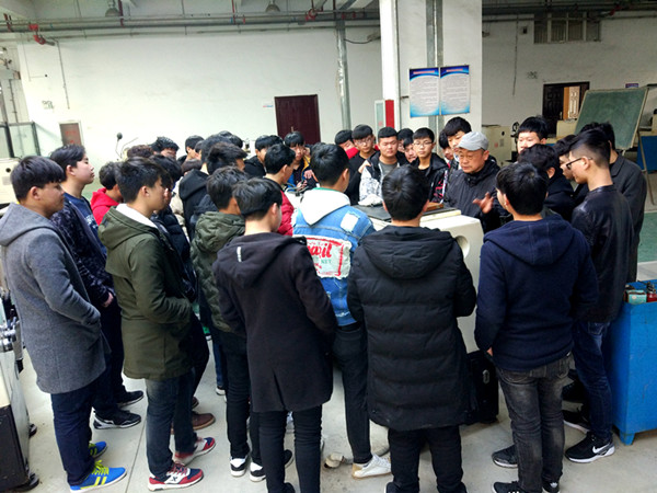 在實(shí)訓(xùn)樓,授課老師在實(shí)驗(yàn)設(shè)備前認(rèn)真講解設(shè)備的機(jī)械構(gòu)造,工作原理,操作方法以及安全注意事項(xiàng)。學(xué)生們圍繞在老師周圍屏息凝神,認(rèn)真聽講。