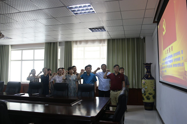 在支部書記李松濤同志的領(lǐng)誓下,支部黨員同志面對(duì)黨旗舉起右拳,莊嚴(yán)宣誓。
