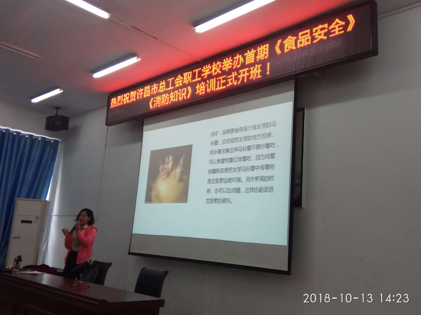????2018年10月13日、10月20日,后勤服務中心聯(lián)合許昌市總工會職工學校對我院餐廳100多名人員進行了《食品安全》和《消防知識》培訓。