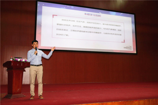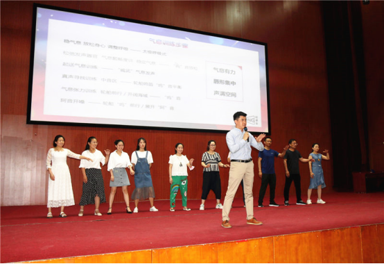 講座分為上下午進(jìn)行。在上午的講座中,周梓銘老師以生動詼諧的語言從語言發(fā)聲訓(xùn)練開始,為大家詳細(xì)分析了教師授課科學(xué)練聲、發(fā)聲的方法。他指出學(xué)習(xí)提高聲音控制、均勻氣息調(diào)控等技巧,可以讓老師正確的避免教學(xué)過程中用嗓疲勞;并從實際出發(fā),同現(xiàn)場教師進(jìn)行實時互動,為老師們輔導(dǎo)氣息訓(xùn)練。