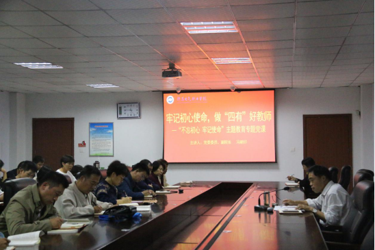 ????9月27日,在全國上下喜迎新中國成立70周年之際,為不斷把“不忘初心、牢記使命”主題教育引向深入,學(xué)院黨委委員、副院長馮朝印以“牢記初心使命,做‘四有’好教師”為主題上了一堂專題黨課,教務(wù)處、設(shè)備與實訓(xùn)管理中心、機(jī)電工程系、公共教學(xué)部全體黨員干部參加。