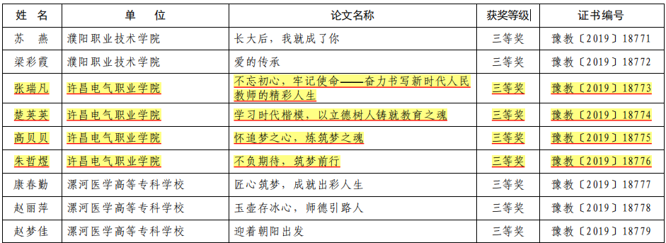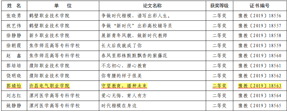 ????日前,省教育廳下發(fā)《“學(xué)習(xí)時(shí)代楷模,成就出彩人生”師德教育主題征文演講比賽和優(yōu)秀案例評選結(jié)果的通知》(教師〔2019〕622號),我院成績優(yōu)異,共有五位教師獲獎(jiǎng)。