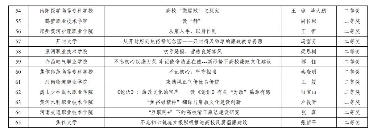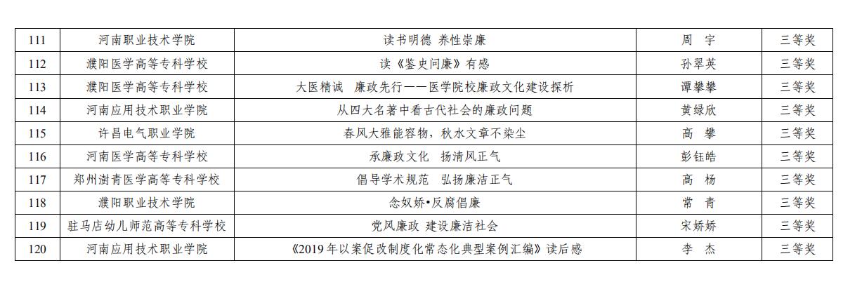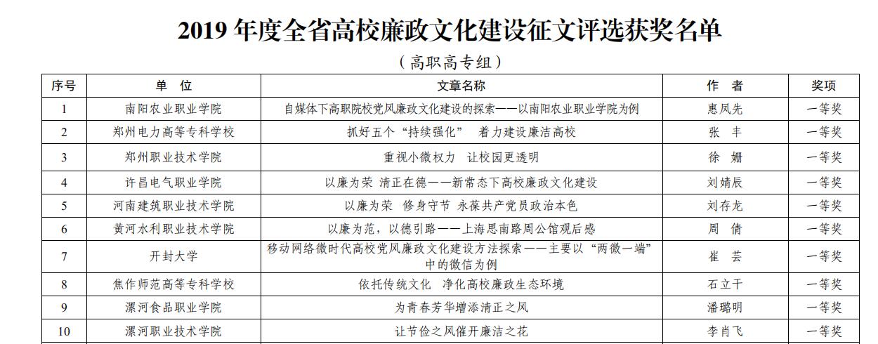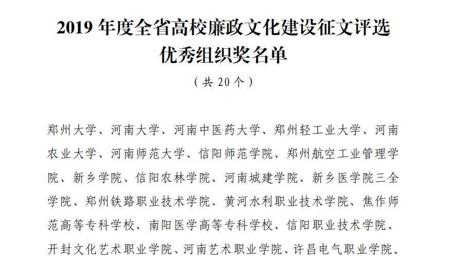 ????近日,中共河南省委高校工委、河南省教育廳下發(fā)了《關于公布2019年度全省高校廉政文化建設征文活動評選結果的通知》(豫高發(fā)〔2019〕65號),我院報送的作品在這次征文評選活動中分別獲得一、二、三等獎,并在全省本專科院校評出20個優(yōu)秀組織獎,我院為獲獎單位之一。