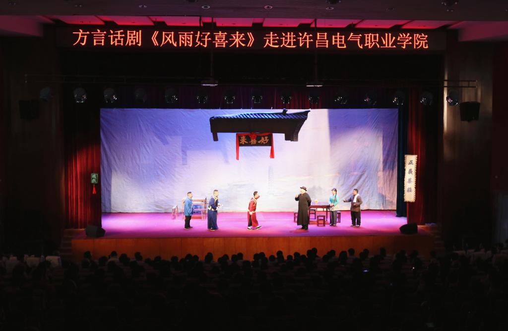 ????為深入貫徹落實習(xí)近平新時代中國特色社會主義思想和黨的十九大精神,弘揚(yáng)中華優(yōu)秀傳統(tǒng)文化,豐富校園文化生活,11月27日至28日,許昌市文化廣電和旅游局送文化進(jìn)校園活動走進(jìn)我院,市群藝館在學(xué)院行政樓會議中心為廣大師生演出原創(chuàng)方言話劇《風(fēng)雨好喜來》。學(xué)院副院長馮朝印、紀(jì)委書記張明慧,院長辦公室主任胡曉敏與全院千余名師生共同觀看了演出。