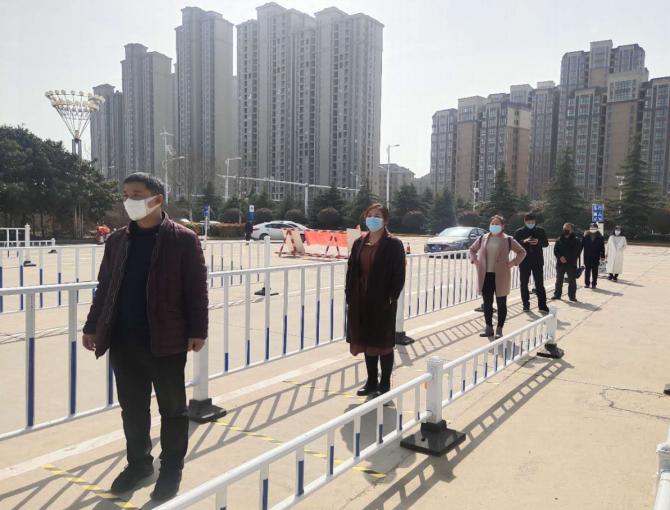 學(xué)生排隊報道,戴口罩,依據(jù)地面間隔線,間隔一米以上