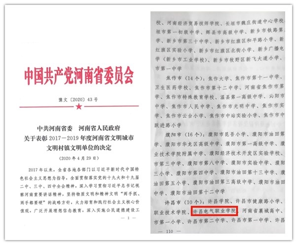 ????喜訊!近日,中共河南省委、河南省人民政府印發(fā)《關(guān)于表彰2017—2019年度河南省文明城市文明村鎮(zhèn)文明單位的決定》(豫文〔2020〕43號(hào)),我院被授予“河南省文明校園”稱號(hào)。