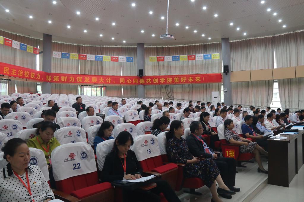 ????院長楊德嶺代表學(xué)院向大會(huì)作題為《守正創(chuàng)新促發(fā)展,砥礪奮進(jìn)譜新篇》的工作報(bào)告。報(bào)告從十一個(gè)方面全面回顧了學(xué)院近年的工作。報(bào)告指出,過去五年,在市委市政府的正確領(lǐng)導(dǎo)和省市教育廳、人社廳的大力支持下,學(xué)院以習(xí)近平新時(shí)代中國特色社會(huì)主義思想為引領(lǐng),全面貫徹落實(shí)黨的教育方針,落實(shí)立德樹人的根本任務(wù),堅(jiān)持立足地方辦學(xué),積極融入?yún)^(qū)域經(jīng)濟(jì)建設(shè)和社會(huì)發(fā)展;聚焦職業(yè)教育現(xiàn)代化改革方向,不斷完善辦學(xué)支撐體系,基本形成了以黨建領(lǐng)發(fā)展,以人才為根本,以改革促創(chuàng)新,以項(xiàng)目提內(nèi)涵,以特色添活力,以服務(wù)為導(dǎo)向的發(fā)展主線,各項(xiàng)事業(yè)得到穩(wěn)步推進(jìn),辦學(xué)水平得到明顯提升,辦學(xué)實(shí)力不斷增強(qiáng),在部分領(lǐng)域成功實(shí)現(xiàn)了由跟跑到超越,再到領(lǐng)跑的目標(biāo),為地方發(fā)展做出了積極貢獻(xiàn),為學(xué)院持續(xù)發(fā)展、跨越發(fā)展奠定了堅(jiān)實(shí)基礎(chǔ)。