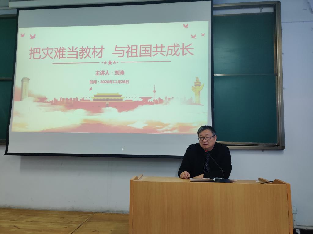 ????11月26日下午,在教學(xué)樓A211多媒體教室,學(xué)院副院長(zhǎng)劉濤為大學(xué)生代表上了一堂以“把災(zāi)難當(dāng)教材,與祖國(guó)共成長(zhǎng)”為主題的思政課。他以戰(zhàn)“疫”為核心進(jìn)行選題,結(jié)合親身經(jīng)歷,用生動(dòng)的語(yǔ)言和深厚的內(nèi)涵啟迪當(dāng)代大學(xué)生要把災(zāi)難當(dāng)教材,再次梳理愛國(guó)教育、生命教育、信念教育、科學(xué)教育與道德教育,構(gòu)建正確的世界觀、人生觀、價(jià)值觀。