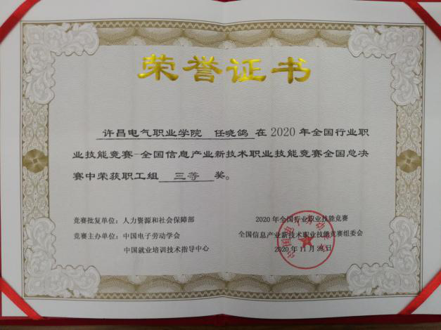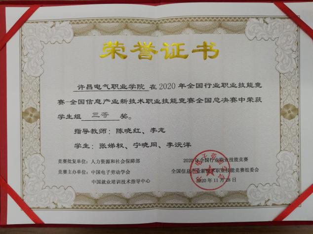 2020年11月27日—28日,由人力資源和社會(huì)保障部、中國電子勞動(dòng)學(xué)會(huì)、中國就業(yè)培訓(xùn)技術(shù)指導(dǎo)中心主辦、南京信息職業(yè)技術(shù)學(xué)院承辦、多家單位協(xié)辦的2020年全國行業(yè)職業(yè)技能競(jìng)賽—全國信息產(chǎn)業(yè)新技術(shù)職業(yè)技能競(jìng)賽全國總決賽在江蘇南京落下帷幕,我院選手信息工程系教師任曉鴿,學(xué)生張娣權(quán)、寧曉同、李沅洋(指導(dǎo)教師:陳曉紅、李龍)經(jīng)過激烈角逐后,分別榮獲職工組和學(xué)生組三等獎(jiǎng)。