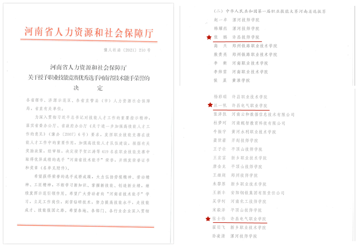 近日,河南省人力資源和社會(huì)保障廳對(duì)419名在職業(yè)技能競(jìng)賽中取得優(yōu)異成績(jī)的選手授予“河南省技術(shù)能手”榮譽(yù),并頒發(fā)榮譽(yù)證書和獎(jiǎng)?wù)隆N以簩W(xué)子張鵬、汪一帆、張士偉憑借在中華人民共和國(guó)第一屆職業(yè)技能大賽中的優(yōu)異成績(jī),獲評(píng)“河南省技術(shù)能手”榮譽(yù)稱號(hào)。