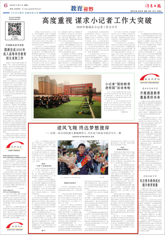 獲獎(jiǎng)作品刊發(fā)于2020年12月21日《許昌日?qǐng)?bào)》第六版,文章專訪了我院參加中華人民共和國第一屆職業(yè)技能大賽載譽(yù)歸來的學(xué)子汪一帆,他所獲得的可再生能源項(xiàng)目銅牌,是河南代表隊(duì)摘得的11塊獎(jiǎng)牌之一,也是我市唯一的獲獎(jiǎng)學(xué)生,獎(jiǎng)牌含金量極高。文章真實(shí)的向關(guān)注此次獲獎(jiǎng)的社會(huì)各界人士展示了學(xué)院教練團(tuán)隊(duì)和汪一帆克服重重困難積極備戰(zhàn)最終取得喜人成績(jī)的艱辛過程。文章刊出后,社會(huì)反響強(qiáng)烈,對(duì)積極引導(dǎo)當(dāng)代大學(xué)生積極向上、自強(qiáng)不息起到了良好的推動(dòng)作用,展現(xiàn)了職校生也可以通過努力閃現(xiàn)自我光芒,不負(fù)青春年華的正能量,更進(jìn)一步彰顯了許昌職業(yè)教育的活力和競(jìng)爭(zhēng)力,為許昌經(jīng)濟(jì)社會(huì)高質(zhì)量發(fā)展凝心聚力。