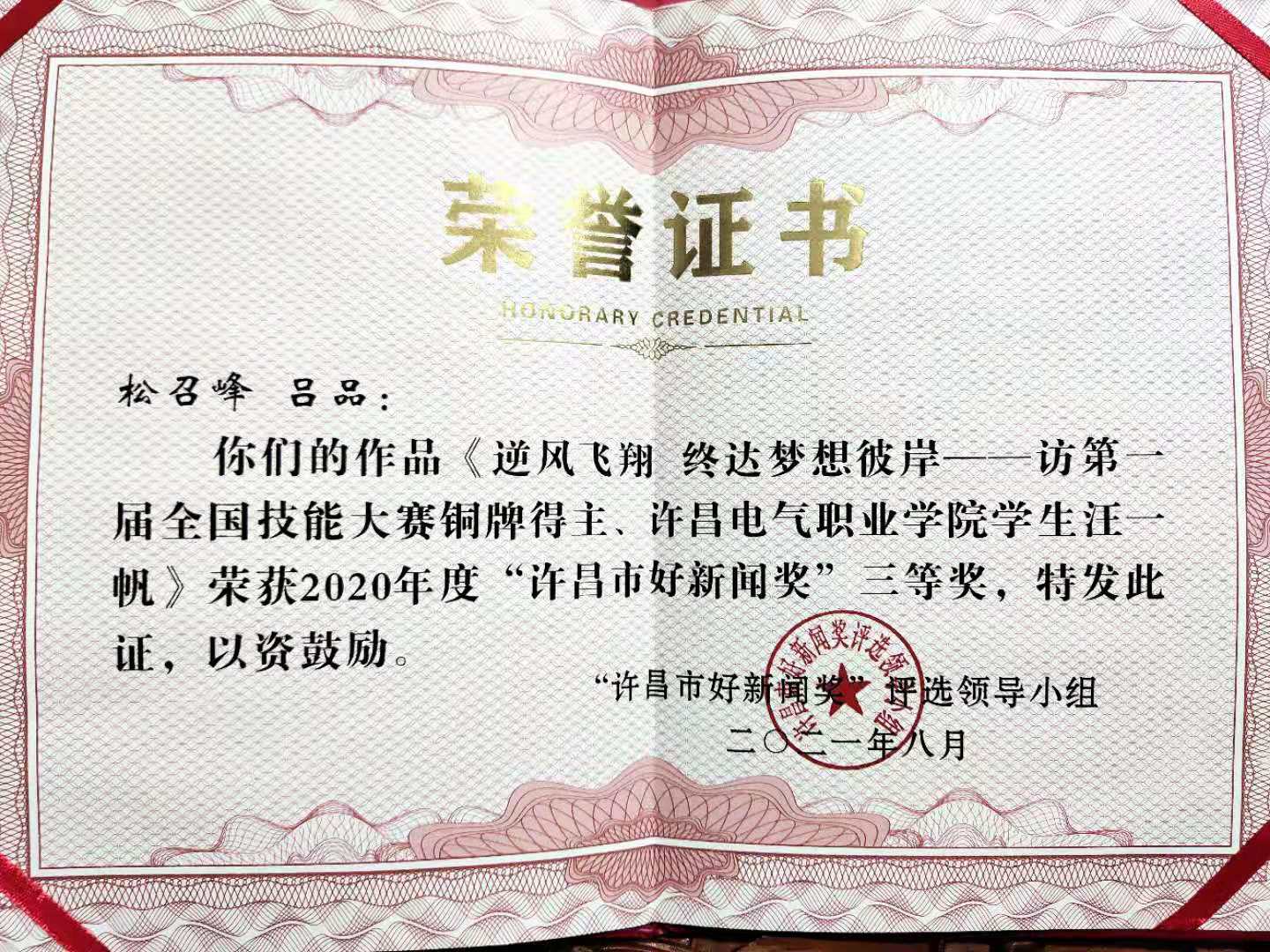 近日,2020年度“許昌市好新聞獎(jiǎng)”評(píng)選結(jié)果揭曉,我院宣傳部選送的參評(píng)作品《逆風(fēng)飛翔 終達(dá)夢(mèng)想彼岸——訪第一屆全國技能大賽銅牌得主、許昌電氣職業(yè)學(xué)院學(xué)生汪一帆》榮獲三等獎(jiǎng)。