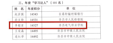 后勤管理與基建處周聚海、李根星和公共教學部劉會彩三位老師在許昌市尋找“學習強國”學習達人活動中,被評為年度“學習達人”;李佩穎被評為“優(yōu)秀管理員”。