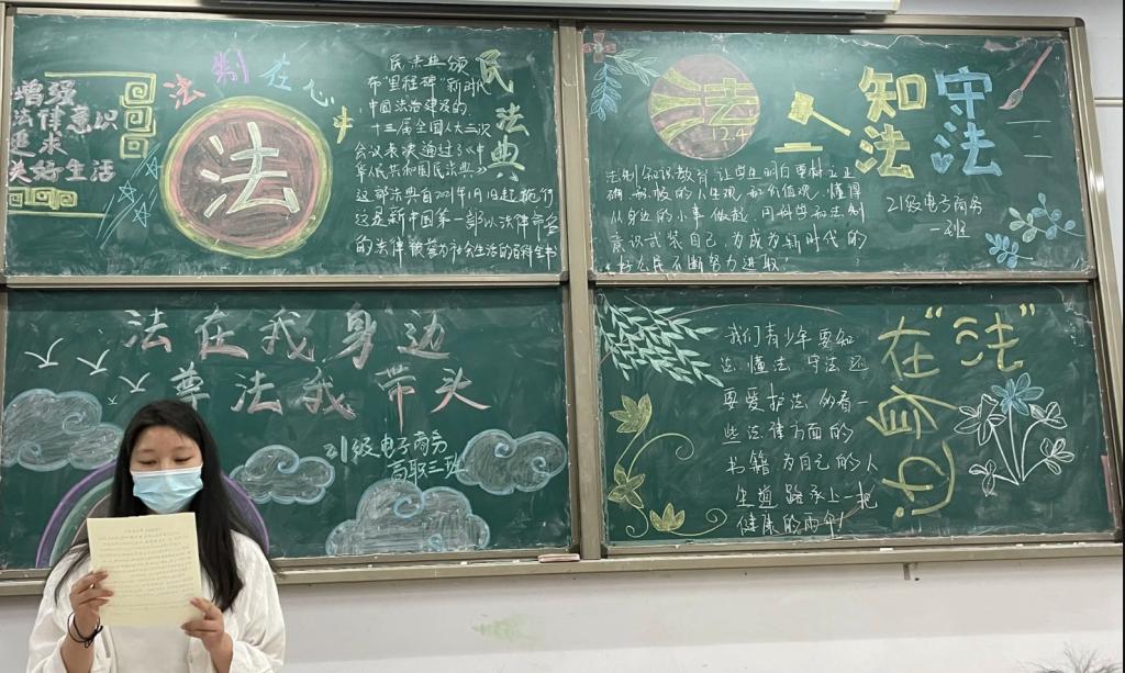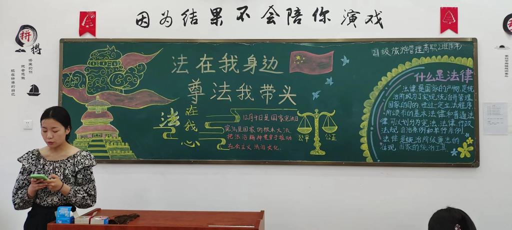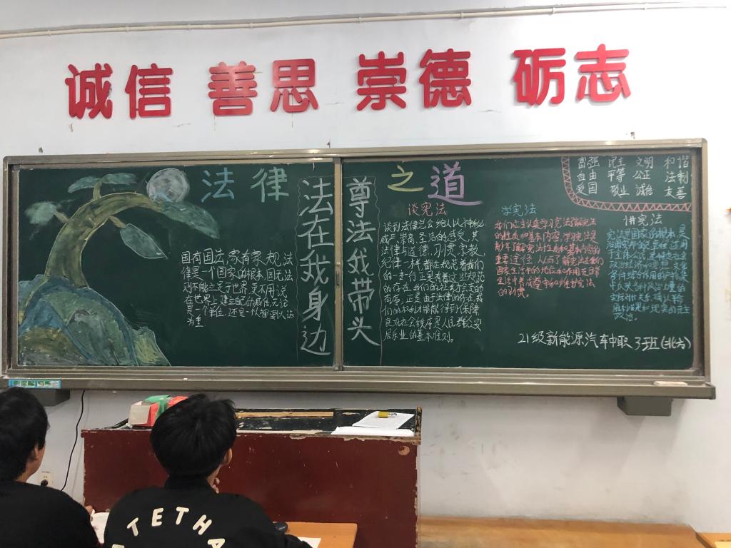 各班以“法在我身邊 尊法我?guī)ь^”為主題,在本班教室辦黑板報(bào),普及法治知識。通過團(tuán)課的形式,向?qū)W生大力宣傳中國特色社會(huì)主義法治體系和國家基本法律制度,使廣大學(xué)生全面深刻理解法律基本原則和精神,充分認(rèn)識社會(huì)主義制度的優(yōu)越性,進(jìn)一步增強(qiáng)學(xué)生的公民意識、愛國意識和民主法治意識。