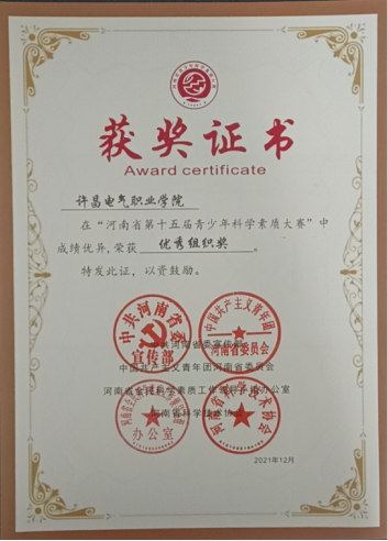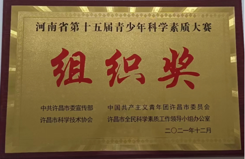 近日,我院喜獲中共河南省委宣傳部、中國共產(chǎn)主義青年團河南省委員會、河南省全民科學(xué)素質(zhì)工作領(lǐng)導(dǎo)小組辦公室、河南省科學(xué)技術(shù)協(xié)會聯(lián)合授予的"河南省第十五屆青少年科學(xué)素質(zhì)大賽"優(yōu)秀組織獎和中共許昌市委宣傳部、中國共產(chǎn)主義青年團許昌市委員會、許昌市全民科學(xué)素質(zhì)工作領(lǐng)導(dǎo)小組辦公室、許昌市科學(xué)技術(shù)協(xié)會聯(lián)合授予的"河南省第十五屆青少年科學(xué)素質(zhì)大賽"組織獎。