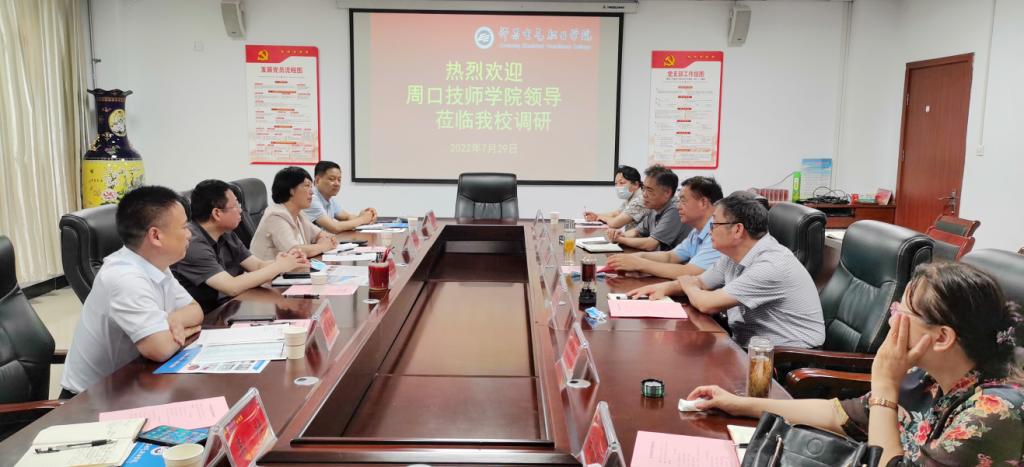 7月29日,周口技師學(xué)院院長韓林一行到我院就教務(wù)教學(xué)管理、學(xué)生管理、實習(xí)就業(yè)、產(chǎn)教融合等方面進行考察調(diào)研。院長楊德嶺,副院長劉濤、馮朝印參加調(diào)研,并舉行座談會。教務(wù)處、學(xué)生處、招生就業(yè)處等單位負責(zé)人參加調(diào)研和座談會。