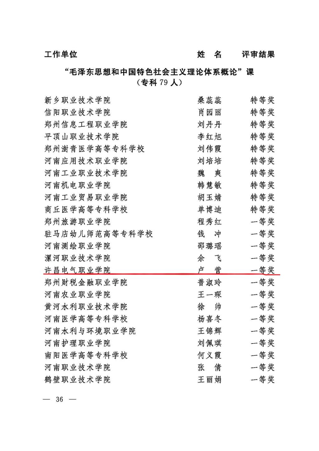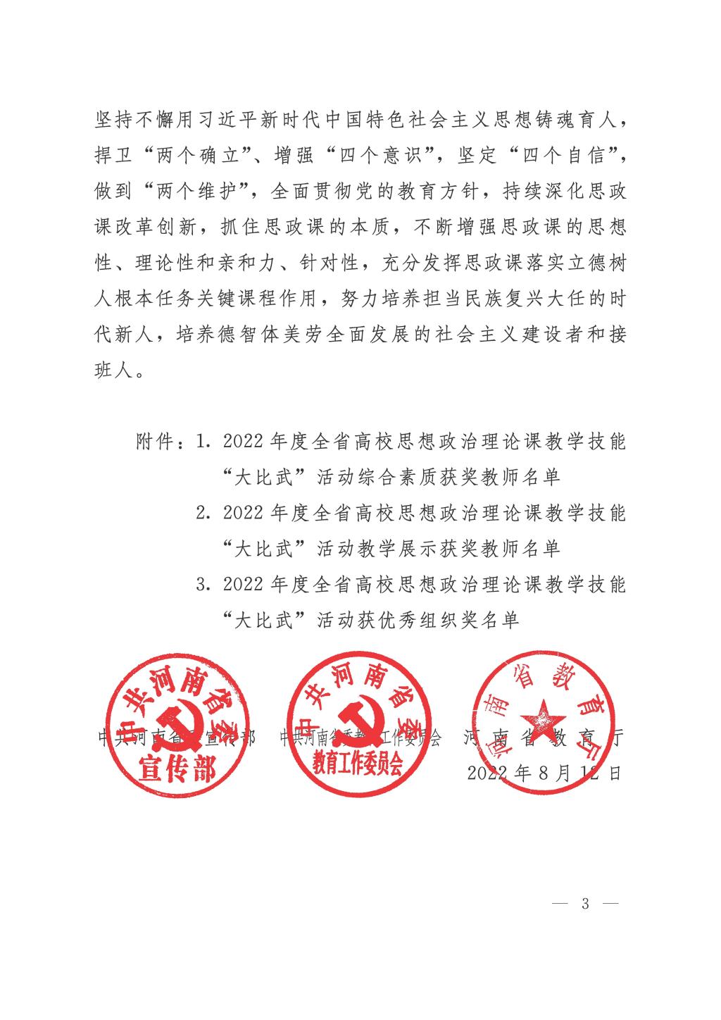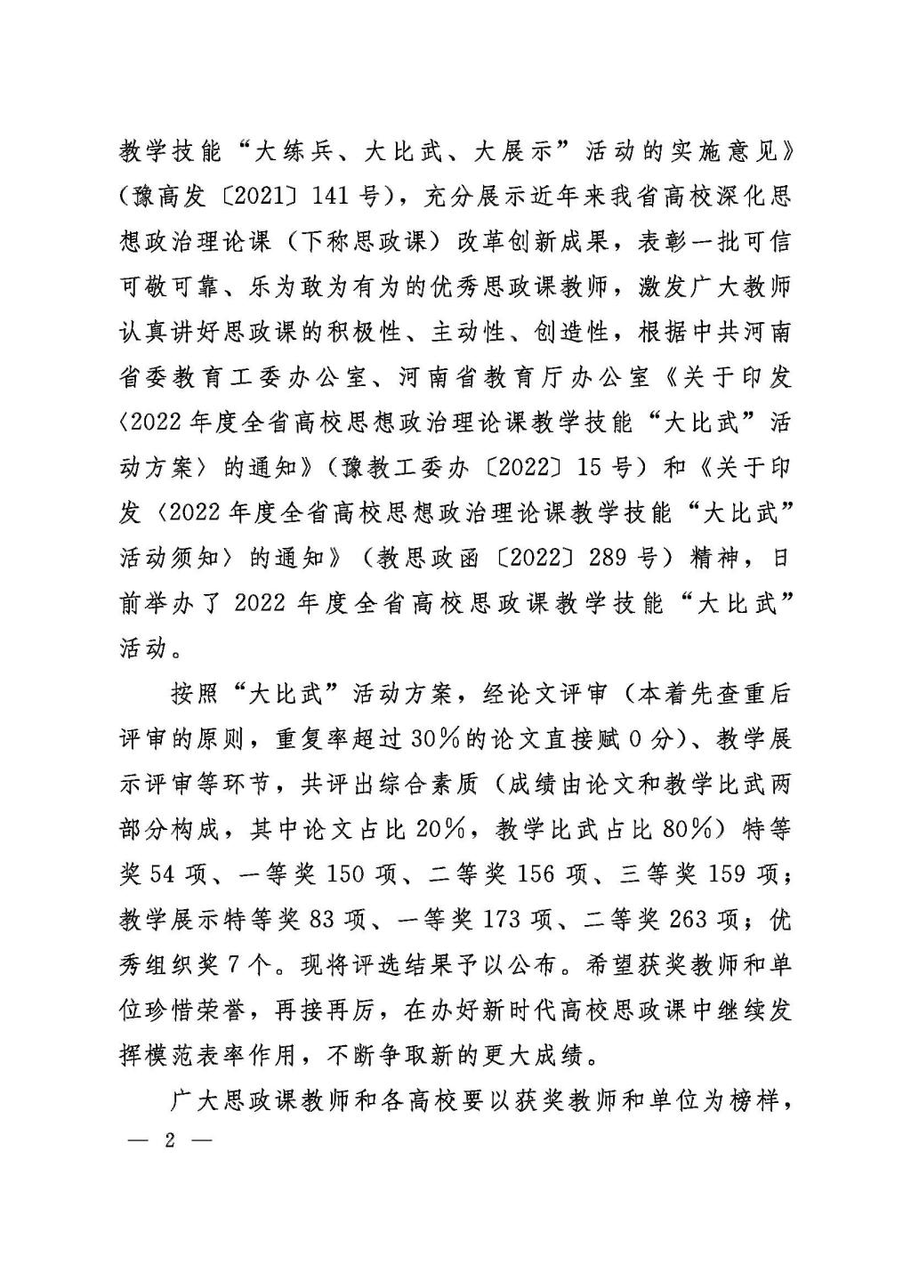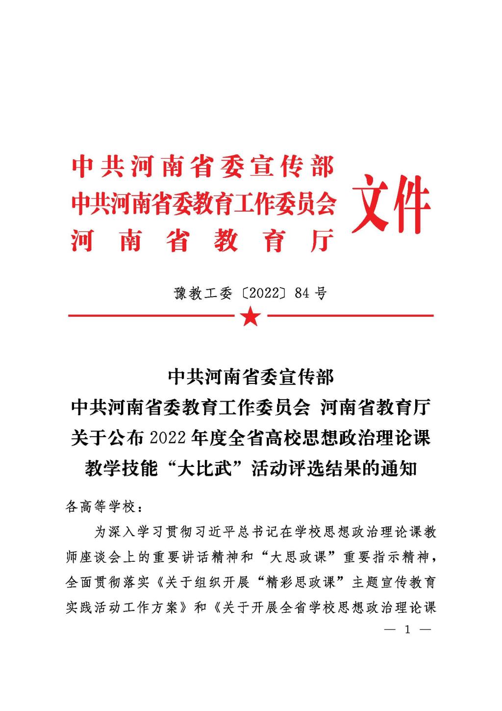 近日,中共河南省委宣傳部、河南省委教育工委、河南省教育廳發(fā)布了《關于公布2022年全省高校思想政治理論課教學技能“大比武”活動評選結果的通知》(豫教工委〔2022〕84號),對評選結果予以公布。我校盧營、宋貴斌兩位老師參賽并喜獲佳績。其中,盧營在全省專科“毛澤東思想和中國特色社會主義理論體系概論”課中獲得一等獎,宋貴斌在全省專科“思想道德與法治”課中獲得二等獎。