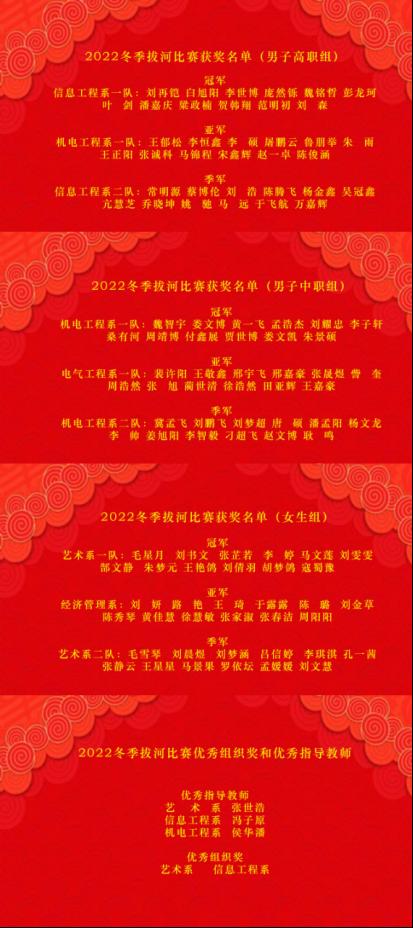 為豐富學(xué)生們的課余文化生活,增進系部之間的交流,增強學(xué)生的凝聚力,培養(yǎng)學(xué)生的團隊合作能力,由我院學(xué)生處主辦、院自管會承辦的“2022年冬季拔河比賽”于本月中旬拉開帷幕。