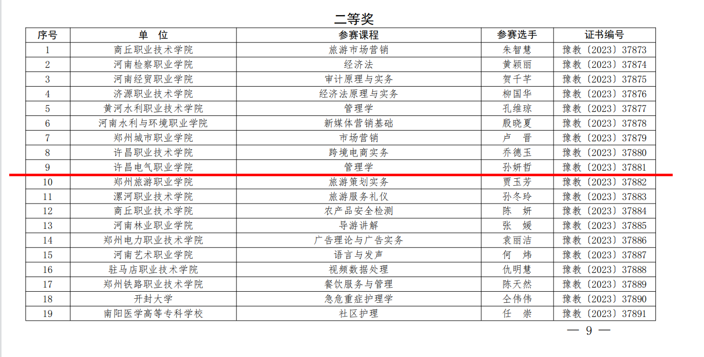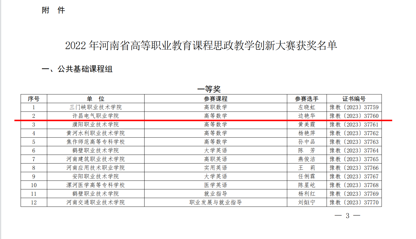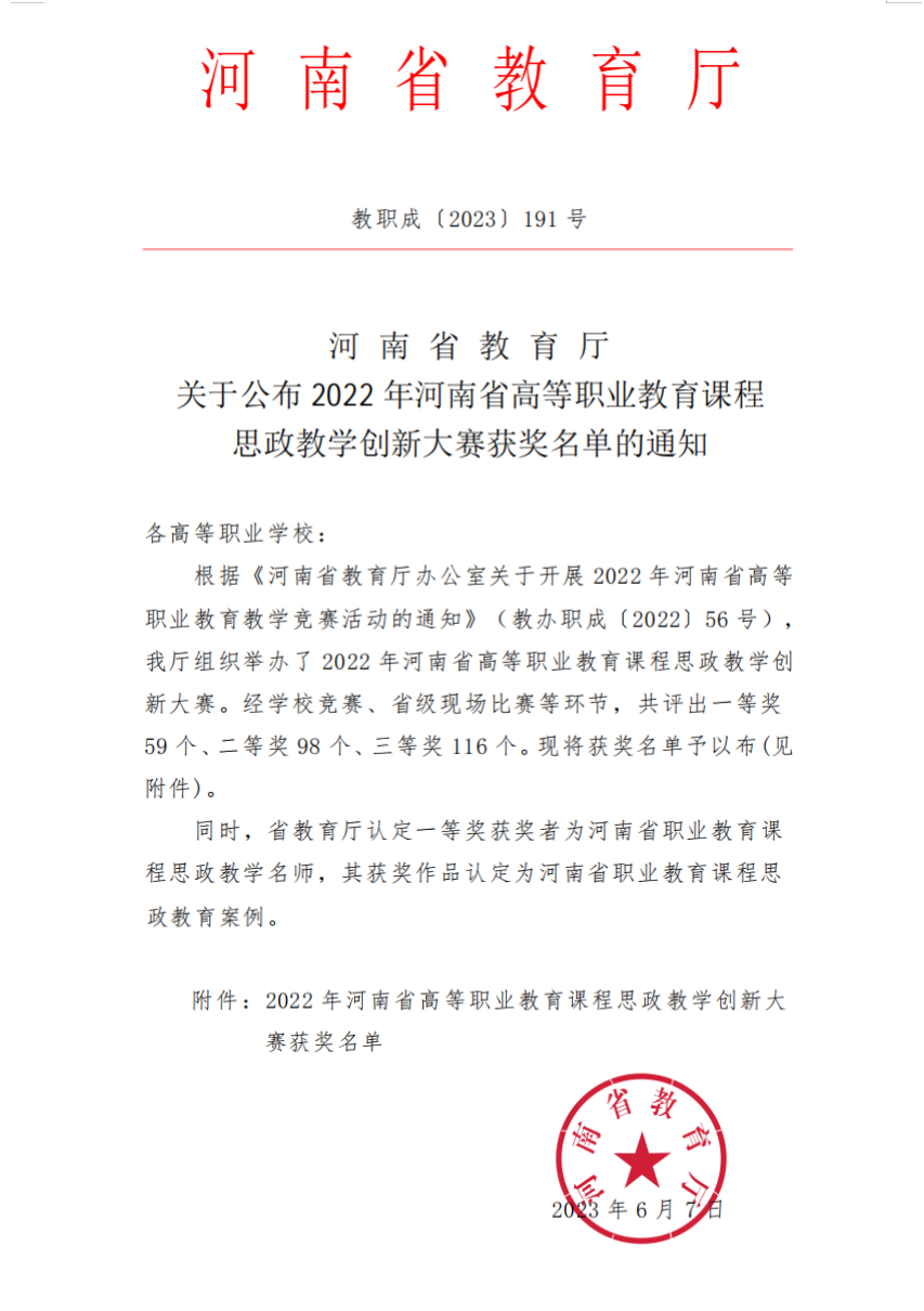 近日,河南省教育廳發(fā)布《河南省教育廳關(guān)于公布2022年河南省高等職業(yè)教育課程思政教學(xué)創(chuàng)新大賽獲獎名單的通知》(教職成〔2023〕191號),我院教師邊艷華榮獲公共基礎(chǔ)課程組一等獎、趙娟娟老師榮獲公共基礎(chǔ)課程組三等獎、孫妍哲老師榮獲財經(jīng)農(nóng)醫(yī)相關(guān)類課程組二等獎的佳績。