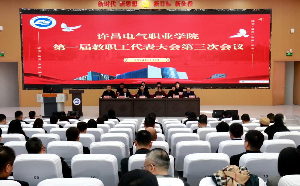 11月27日,許昌電氣職業(yè)學(xué)院第一屆教職工代表大會(huì)第三次會(huì)議在VR思政會(huì)議中心召開(kāi)。本次會(huì)議旨在總結(jié)學(xué)院過(guò)去四年的工作成果,規(guī)劃未來(lái)發(fā)展藍(lán)圖,進(jìn)一步凝聚教職工的智慧與力量,共同推動(dòng)學(xué)院教育事業(yè)高質(zhì)量發(fā)展。大會(huì)在莊嚴(yán)的國(guó)歌聲中拉開(kāi)帷幕。黨委副書(shū)記、院長(zhǎng)高遠(yuǎn)浩,黨委副書(shū)記張明慧,紀(jì)委書(shū)記張曉華,副院長(zhǎng)朱東煜、賈楠出席會(huì)議。工會(huì)主席張貴軍主持會(huì)議。