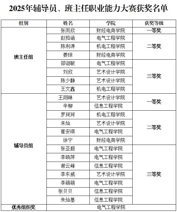 經(jīng)過激烈角逐,輔導(dǎo)員、班主任職業(yè)能力大賽決賽最終決出一等獎(jiǎng)3名,二等獎(jiǎng)7名,三等獎(jiǎng)11名;電氣工程學(xué)院榮獲“優(yōu)秀組織獎(jiǎng)”。院領(lǐng)導(dǎo)為獲獎(jiǎng)集體和個(gè)人頒發(fā)榮譽(yù)證書。