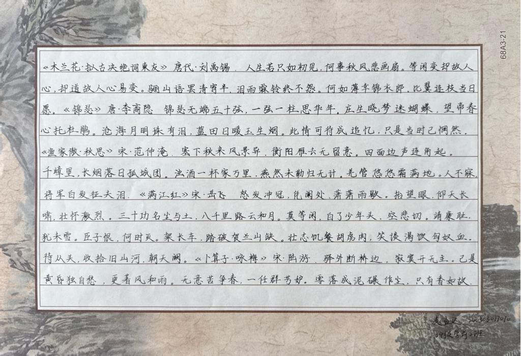 為貫徹黨的二十大和二十屆二中、三中全會(huì)精神,落實(shí)全國(guó)教育大會(huì)精神,實(shí)施《教育強(qiáng)國(guó)建設(shè)規(guī)劃綱要(2024—2035年)》,服務(wù)教育強(qiáng)國(guó)、文化強(qiáng)國(guó)建設(shè),加大國(guó)家通用語(yǔ)言文字推廣力度,傳承發(fā)展中華優(yōu)秀語(yǔ)言文化,落實(shí)全國(guó)青少年讀書(shū)行動(dòng),2025年5月,我院開(kāi)展了2025年中華經(jīng)典誦寫(xiě)講系列活動(dòng),組織舉辦了“誦讀中國(guó)”經(jīng)典誦讀大賽以及“筆墨中國(guó)”漢字書(shū)寫(xiě)大賽。此次大賽的主題為:典耀中華,賡續(xù)文脈。學(xué)院師生們積極踴躍地參與比賽,通過(guò)誦讀、書(shū)寫(xiě)等語(yǔ)言文化活動(dòng),展現(xiàn)出了一系列精彩紛呈的作品。
