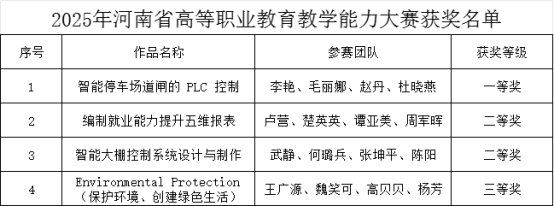 近日,2025年河南省高等職業(yè)教育教學(xué)能力大賽獲獎(jiǎng)名單公布。我院教師團(tuán)隊(duì)在本次大賽共取得1個(gè)省級(jí)一等獎(jiǎng)、2個(gè)省級(jí)二等獎(jiǎng)、1個(gè)省級(jí)三等獎(jiǎng)的優(yōu)異成績(jī)。