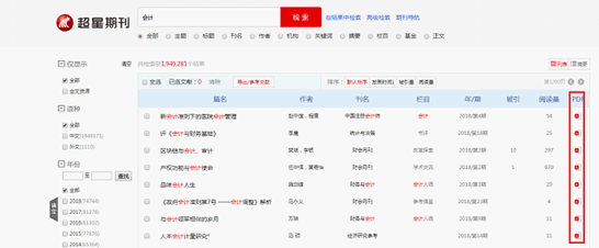檢索結(jié)果中PDF列有紅色圖標(biāo)代表該文章能夠直接下載和在線閱讀。