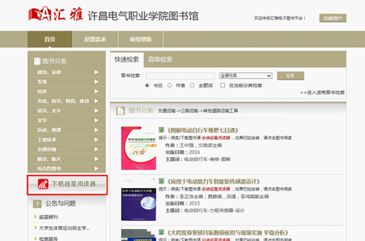目前校內(nèi)超星電子圖書共計(jì)11萬(wàn)冊(cè),可通過(guò)“快速檢索”和“高級(jí)檢索”查找圖書,在閱讀前一定要下載“超星閱讀器”,軟件可從網(wǎng)站左側(cè)欄目指定位置下載,如下圖所示: