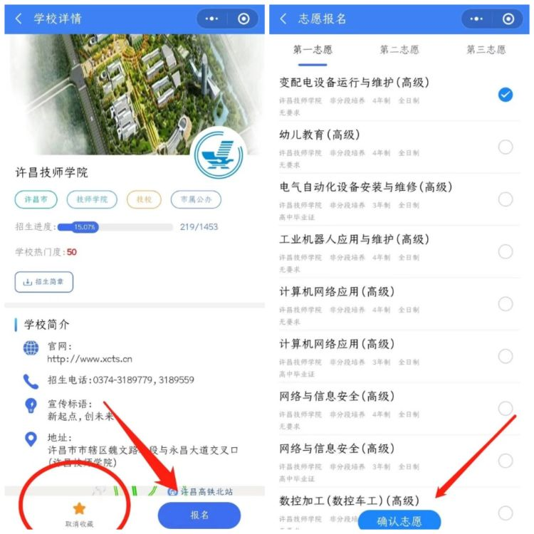 5、選擇“許昌技師學(xué)院”,點擊收藏不迷路,點擊報名→選擇專業(yè)→確認志愿
