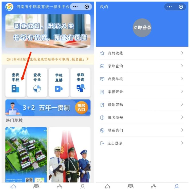 2、進入小程序后,選擇“查找學(xué)校”→注冊登錄(已注冊忽略此步驟)
