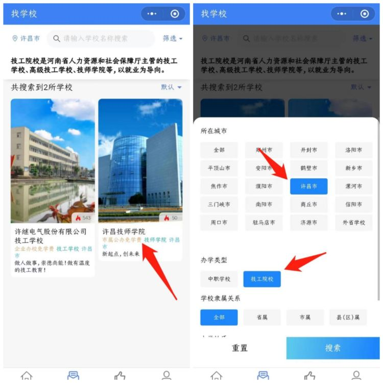4、所在城市選擇“許昌市”,辦學(xué)類型選擇 “技工院校”,篩選出“許昌技師學(xué)院”