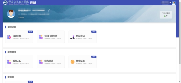 學(xué)生進(jìn)入迎新服務(wù)后在頁面上會看到信息采集、到站登記、繳費入口、綠色通道、繳費結(jié)果、報到單等學(xué)生自助服務(wù)項,自助服務(wù)項需按順序逐一填寫。如下圖所示: