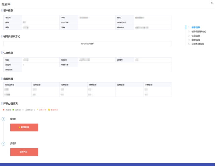 學(xué)生點擊報到單環(huán)節(jié),可進(jìn)入報到單頁面查看自己的個人信息,繳費信息等內(nèi)容,學(xué)生現(xiàn)場報到時,可通過報到單查看報到流程及已完成環(huán)節(jié),讓報到信息實時可查,如下圖所示: