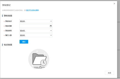 學(xué)生點擊到站登記服務(wù),可在頁面中登記自己前往學(xué)校所達(dá)到的火車站等信息,便于學(xué)校進(jìn)行及時掌握同學(xué)們的到站時間,安排相應(yīng)的車輛前去迎接或自行搭乘交通工具達(dá)到學(xué)校,如下圖所示:
