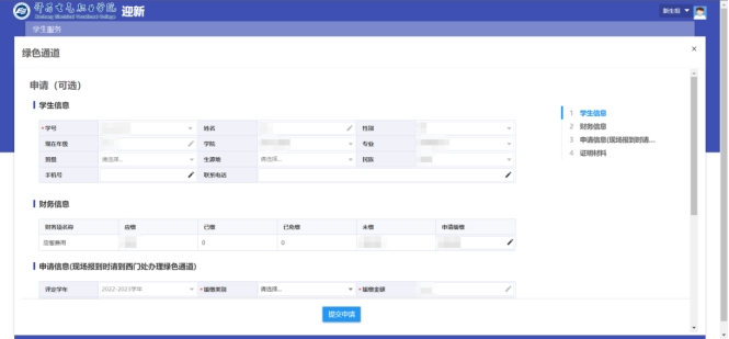 有需要辦理綠色通道可點擊綠色通道服務(wù),學(xué)生可在該界面申請綠色通道,依據(jù)證明材料填寫學(xué)費、住宿費緩繳金額,緩繳各項金額不能超過各項上限,申請“我已申請生源地貸款”的學(xué)生須填寫生源地貸款回執(zhí)碼并上傳貸款合同照片,申請“我準(zhǔn)備到校申請校園地貸款”的學(xué)生須上傳貧困生認(rèn)定表,申請“緩繳學(xué)費”的學(xué)生須按照下方文字格式進(jìn)行編寫陳述理由進(jìn)行申請,學(xué)生綠色通道申請后需要學(xué)院管理員進(jìn)行審核,如學(xué)生不需要辦理此項業(yè)務(wù)可直接跳過。