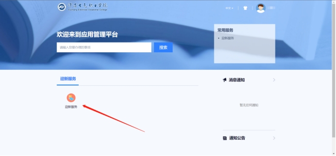 1、學(xué)生輸入賬號和密碼登陸成功之后即可進(jìn)入到首頁,點擊迎新服務(wù)模塊即可進(jìn)入迎新流程辦理環(huán)節(jié)。如下圖所示: