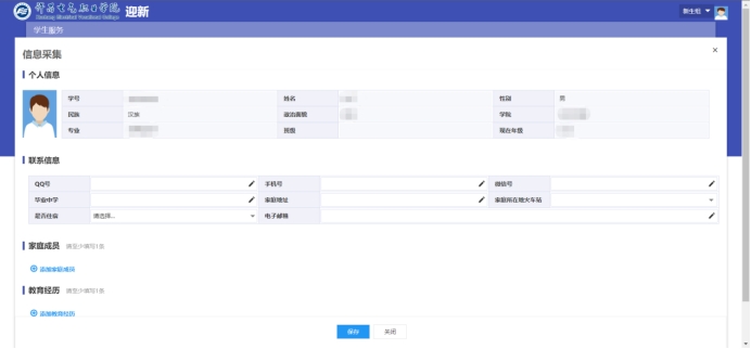 學(xué)生點擊信息采集服務(wù)項,可進(jìn)入學(xué)生詳細(xì)信息界面,包括學(xué)生基本信息、聯(lián)系信息、家庭成員、教育經(jīng)歷等,完善個人信息后,點擊提交按鈕提交信息,如下圖所示: