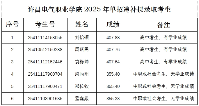 根據(jù)《許昌電氣職業(yè)學(xué)院2025年單獨(dú)招生工作實(shí)施方案》相關(guān)規(guī)定及工作流程,經(jīng)考生本人申請、招生就業(yè)處審核,現(xiàn)對截至2025年4月27日18時(shí)自愿放棄錄取資格的6名考生信息予以公示,名單如下: