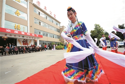 10月9日,許昌市綠園老年公寓,許昌電氣職業(yè)學(xué)院的志愿者在為老人們表演歌伴舞《神山頌》。當(dāng)日是重陽節(jié),許昌電氣職業(yè)學(xué)院組織志愿者來到許昌市綠園老年公寓開展慰問活動,為這里的老人帶來精彩的節(jié)目以及慰問品。